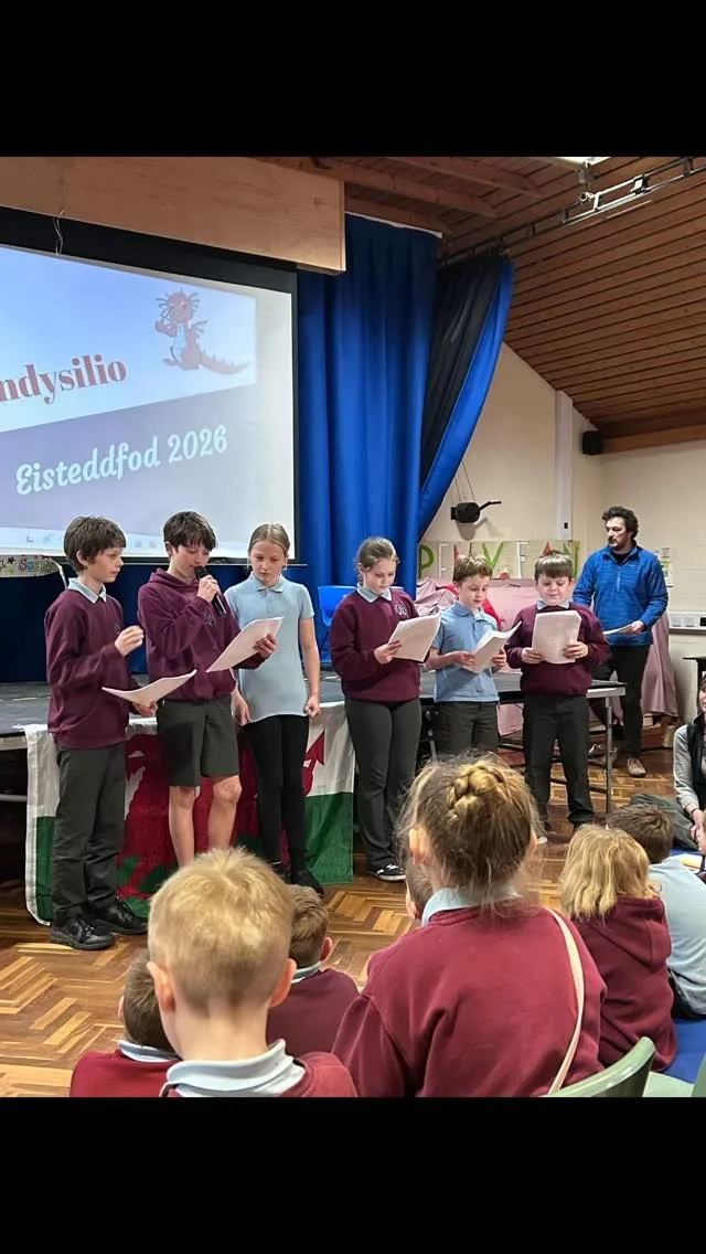 We have an engaging wildlife area where we feed birds, build bug houses, have scavenger hunts and take notice of the wonderful nature around us. As well as the play area on tarmac and the adventure playground, we have a lovely grassy field for football and P.E in the summer! We have access to the community hall for assemblies and P.E sessions, along with Welsh games hosted by the Criw Cymraeg, a group in charge of all Welsh things, at break time. We are a bilingual school with Welsh lessons, along with Helpwr Heddiw every day!